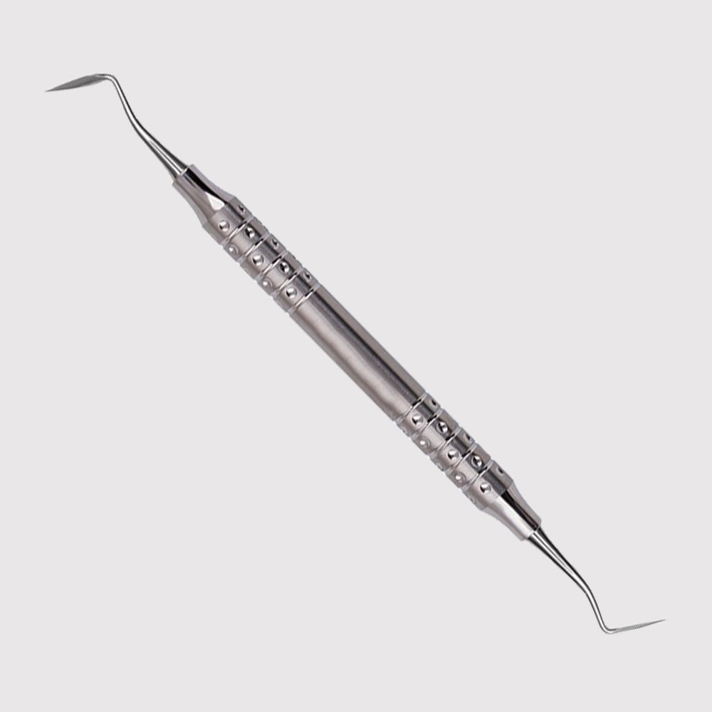 Goldman Fox 11 is double ended instrument with offset spear point blades for use in posterior region.