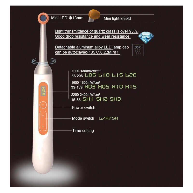 Super high intensity mode (SH): 2200~2400mW/cm².Time setting: 1S,2S,3S.