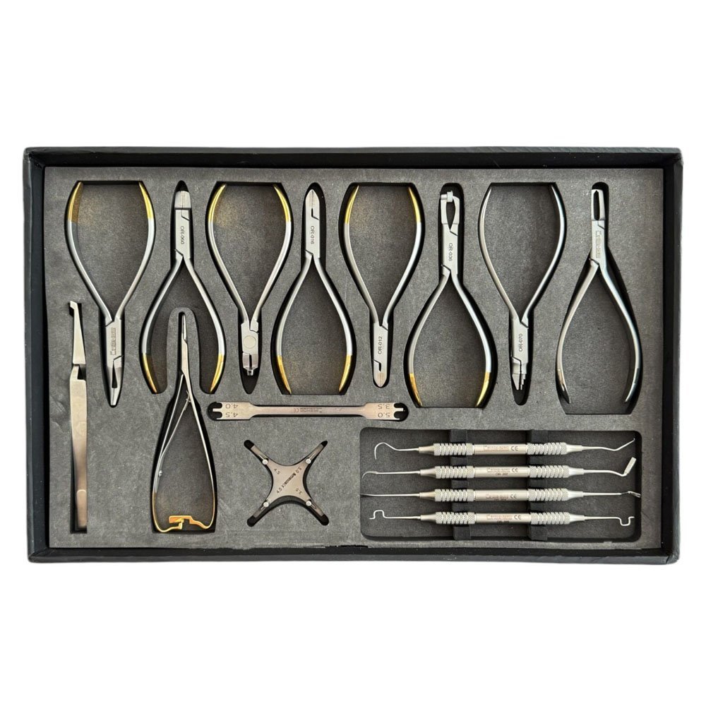 The Orthodontics Kit is a complete, high-performance set of orthodontic instruments designed to support precise and efficient dental procedures. Ideal for professional orthodontists, this kit provides all essential tools for bracket placement, wire adjustment, band removal, and ligature management. Each instrument is made from premium quality stainless steel, with selected tools featuring Tungsten Carbide (TC) tips for enhanced grip, durability, and long-lasting sharpness.