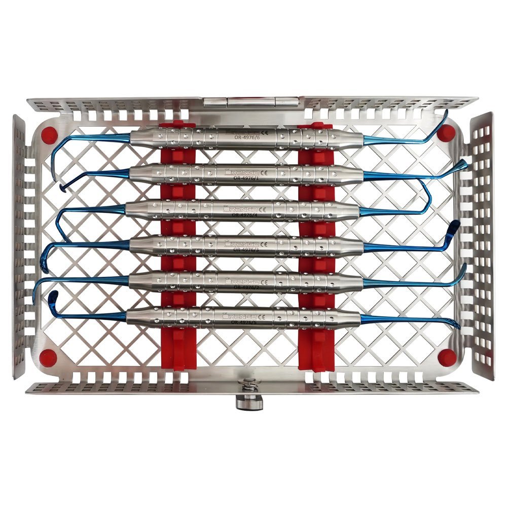 Each instrument in this advanced kit is coated with blue titanium, offering several clinical benefits. The coating provides enhanced corrosion resistance, reduced light reflection, and increased surface hardness, making the tools more durable and comfortable to use during long procedures. The vibrant blue finish also improves visibility, helping clinicians distinguish instruments more easily in sterile setups.
